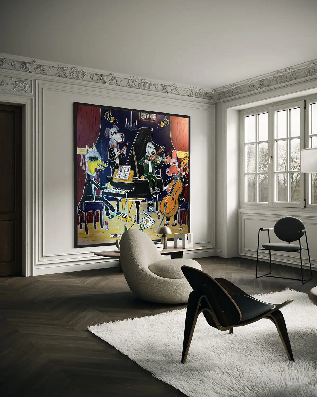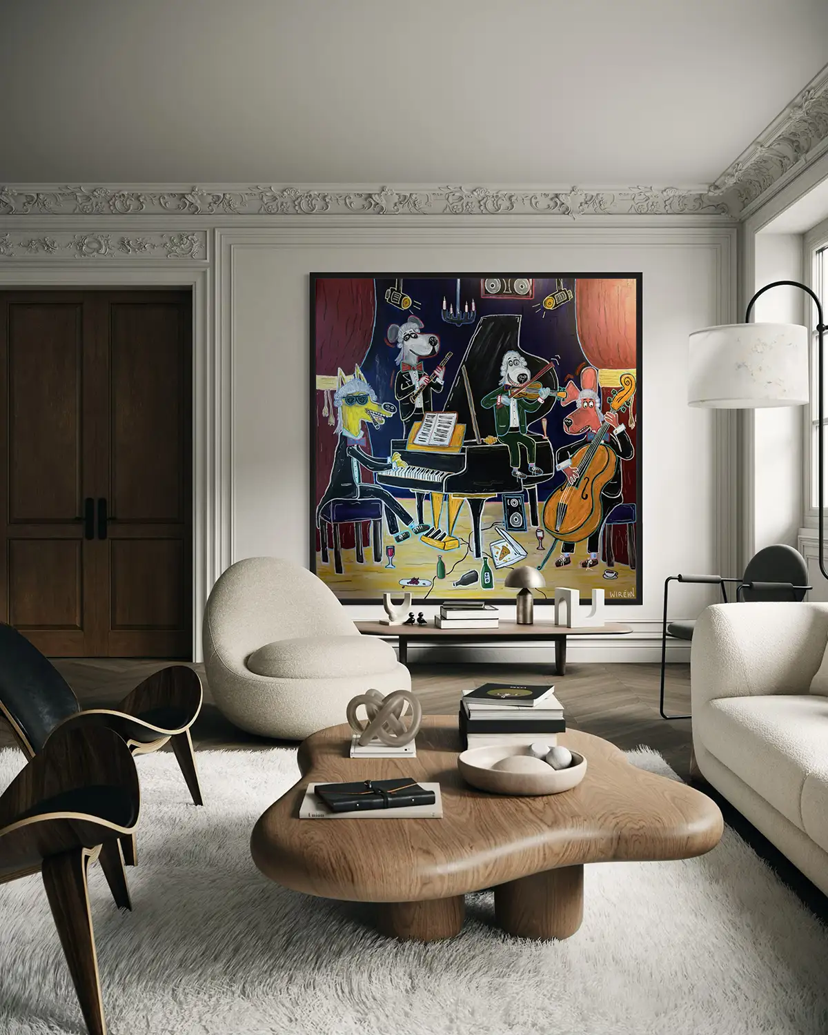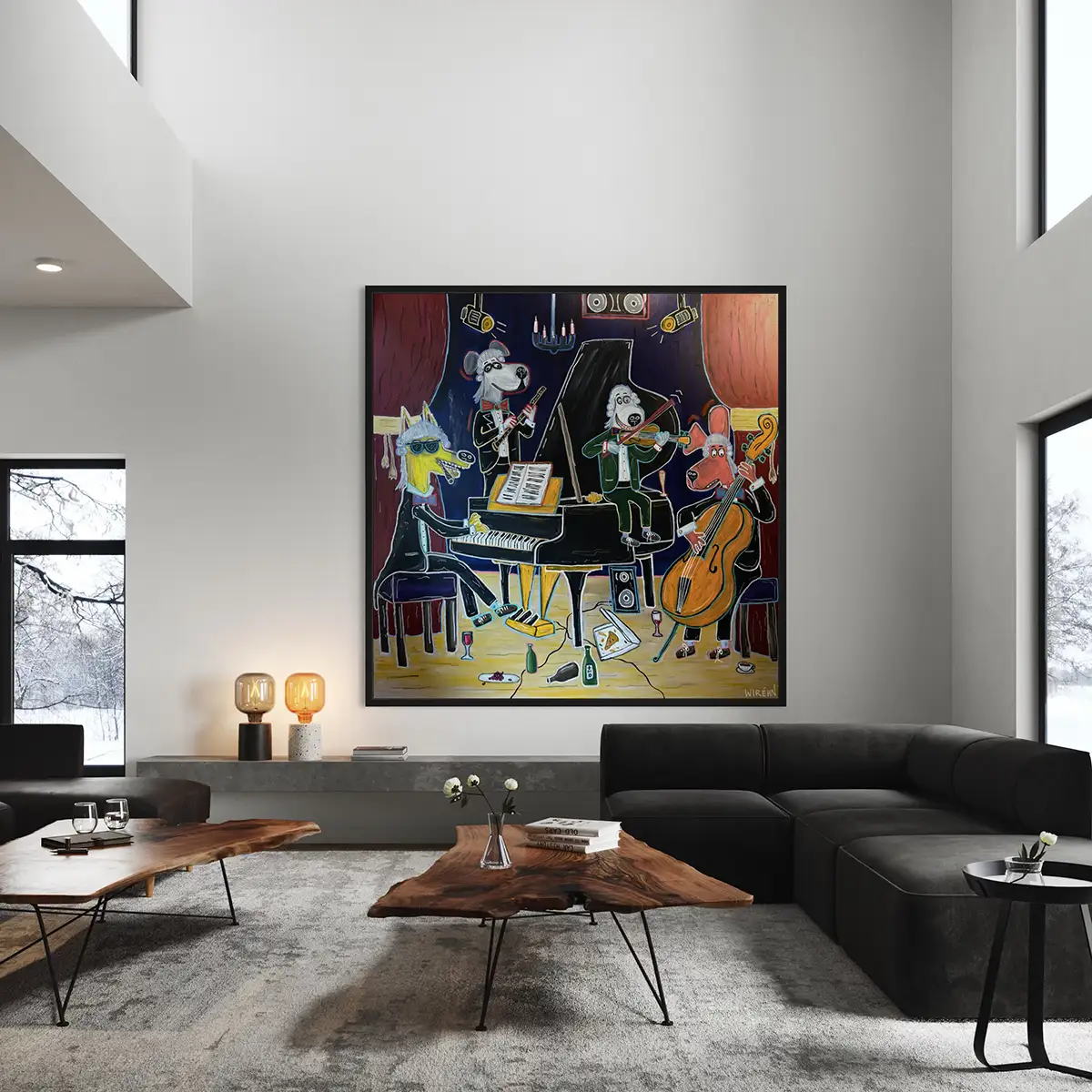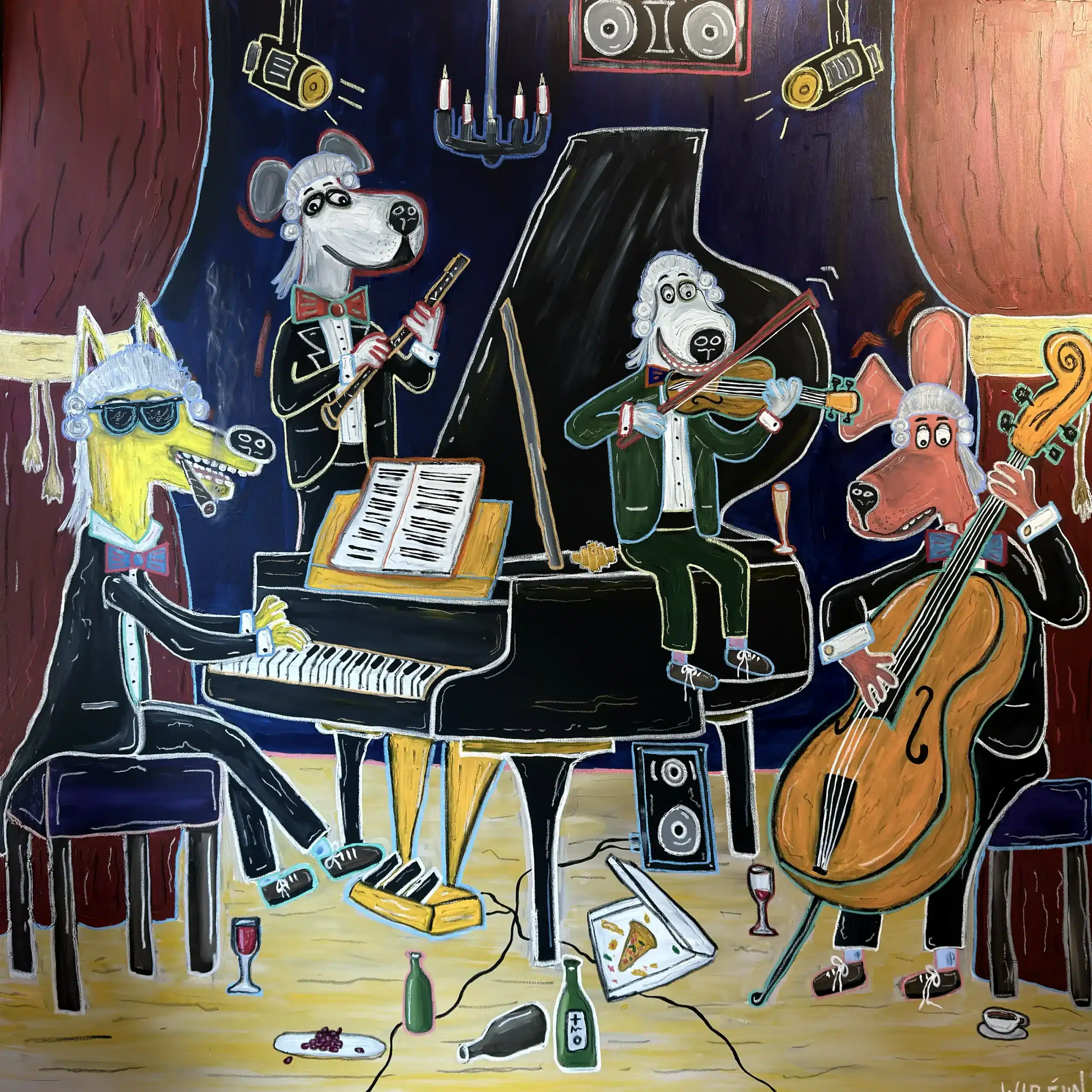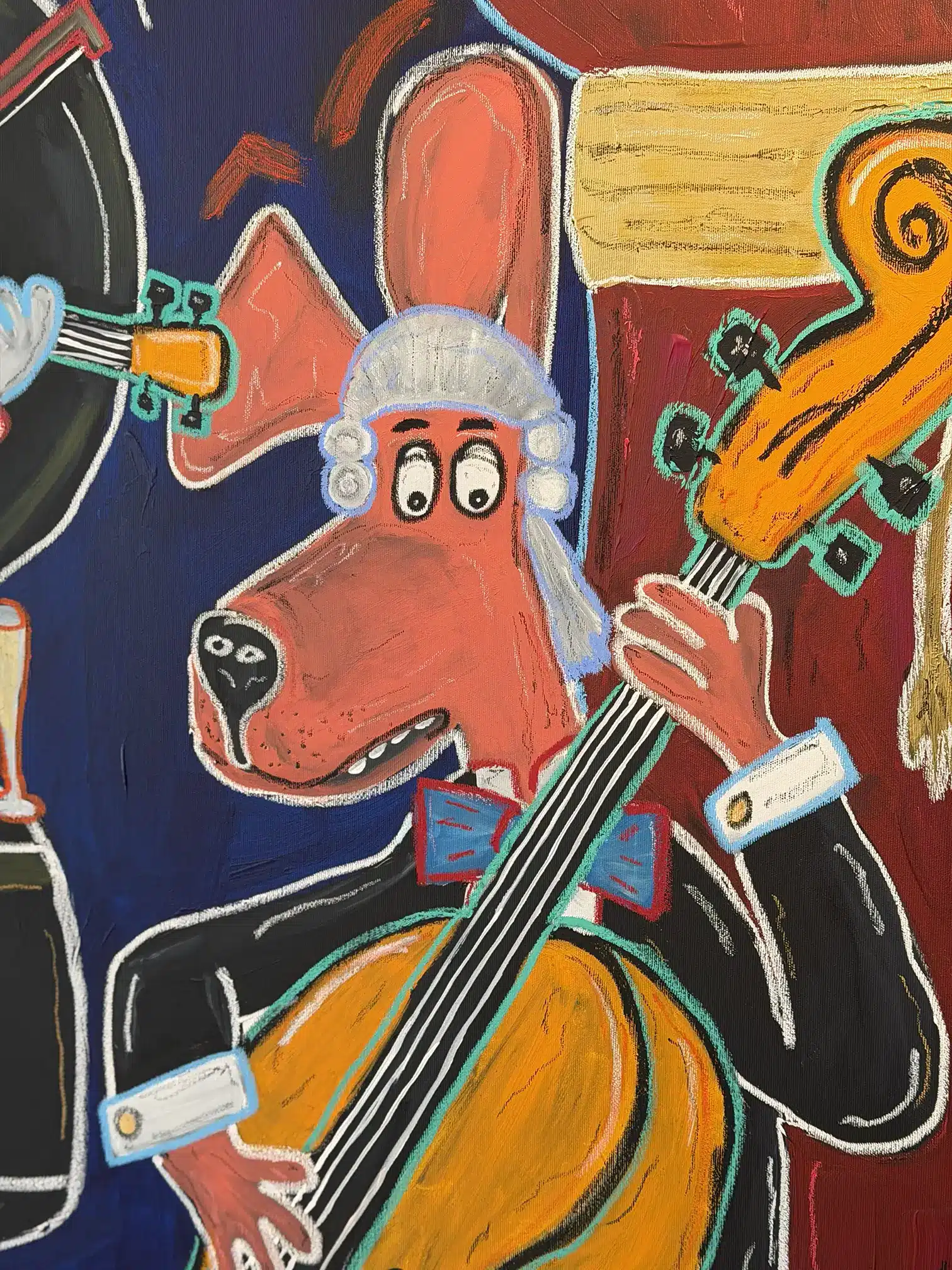 With its bold color palette, whimsical perspective, and impeccable details, Dogs in D Major captures both humor and high art — a celebration of music, joy, and the beauty of not taking life, or art, too seriously.