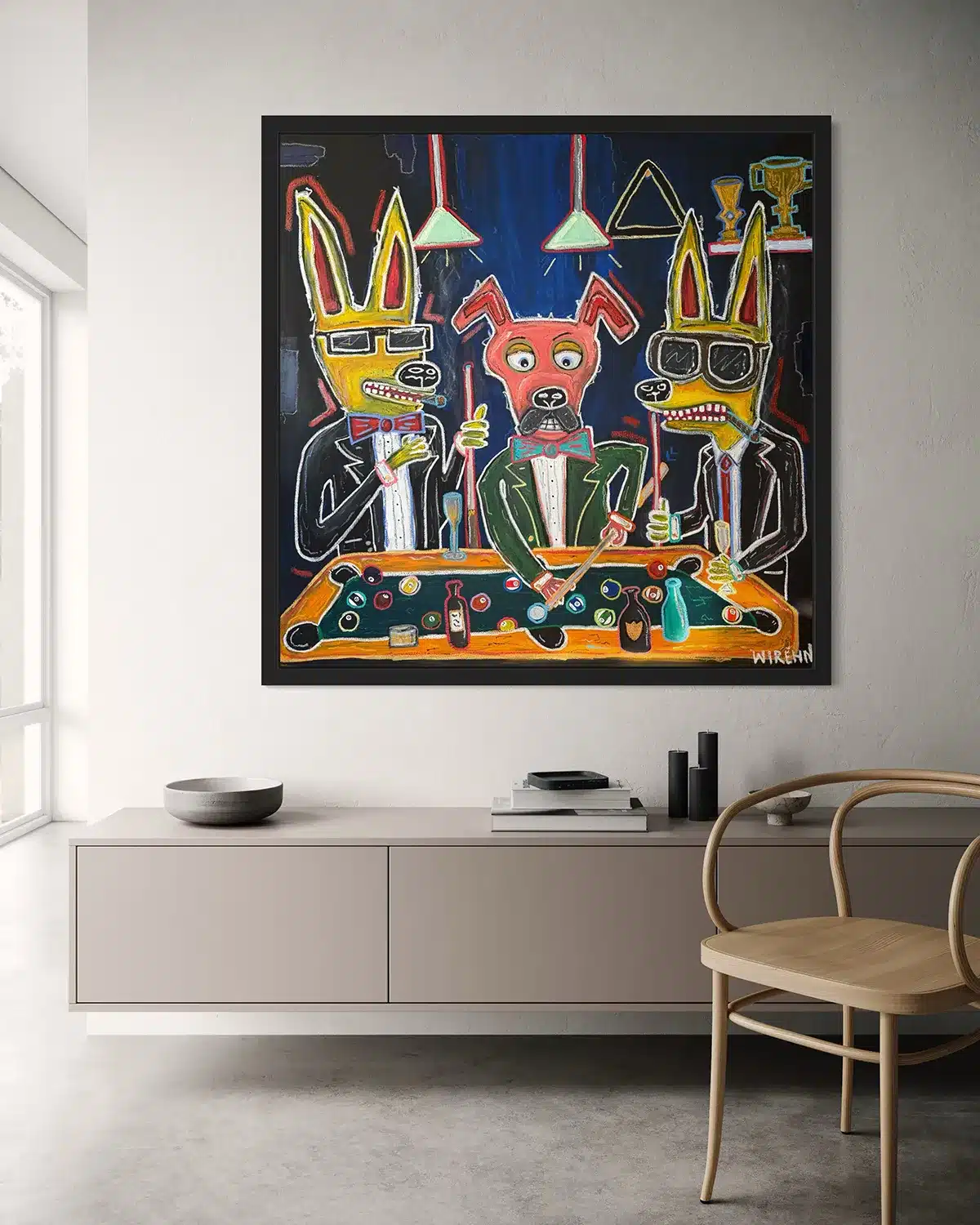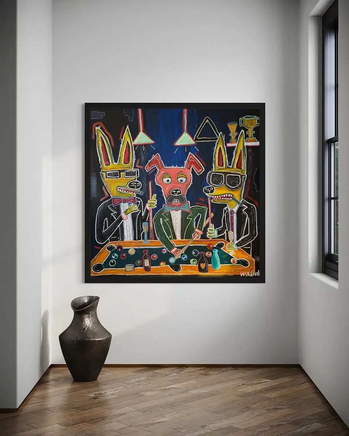 Two of the dogs are smoking cigars and are reasonably nervous that the dog in the middle will win.